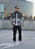 A bold essential that fuses attitude with timeless design. Crafted from premium faux leather, this jacket features fine detailed patches with bold logos, zippered pockets for that unmistakable moto look.